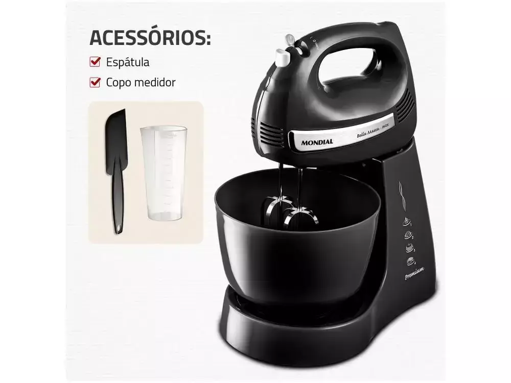 | Itens Inclusos | 1 Batedeira, 2 Tigelas, 1 Par de Batedores, 1 Copo Medidor, 1 Espátula |