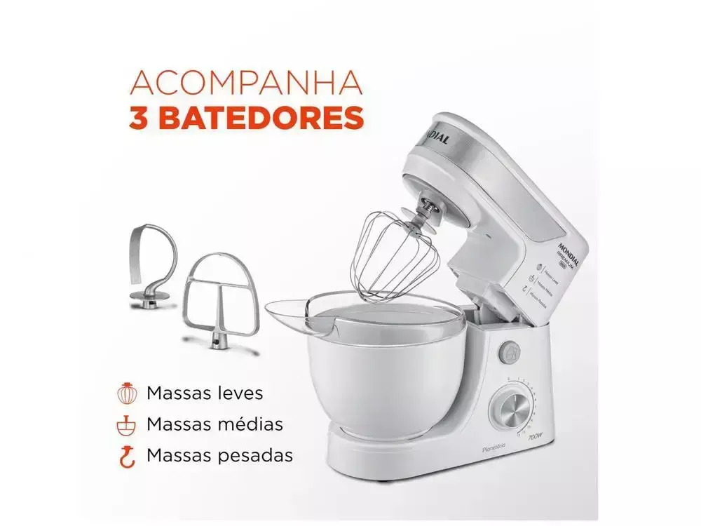 A Batedeira Planetária Premium da Mondial é a peça com design moderno e prático que faltava na sua cozinha. Com 700W de potência, 12 velocidades e duas tigelas de 4,5L, ela facilita o preparo de massas leves a pesadas. Esta versão opera em 220V.