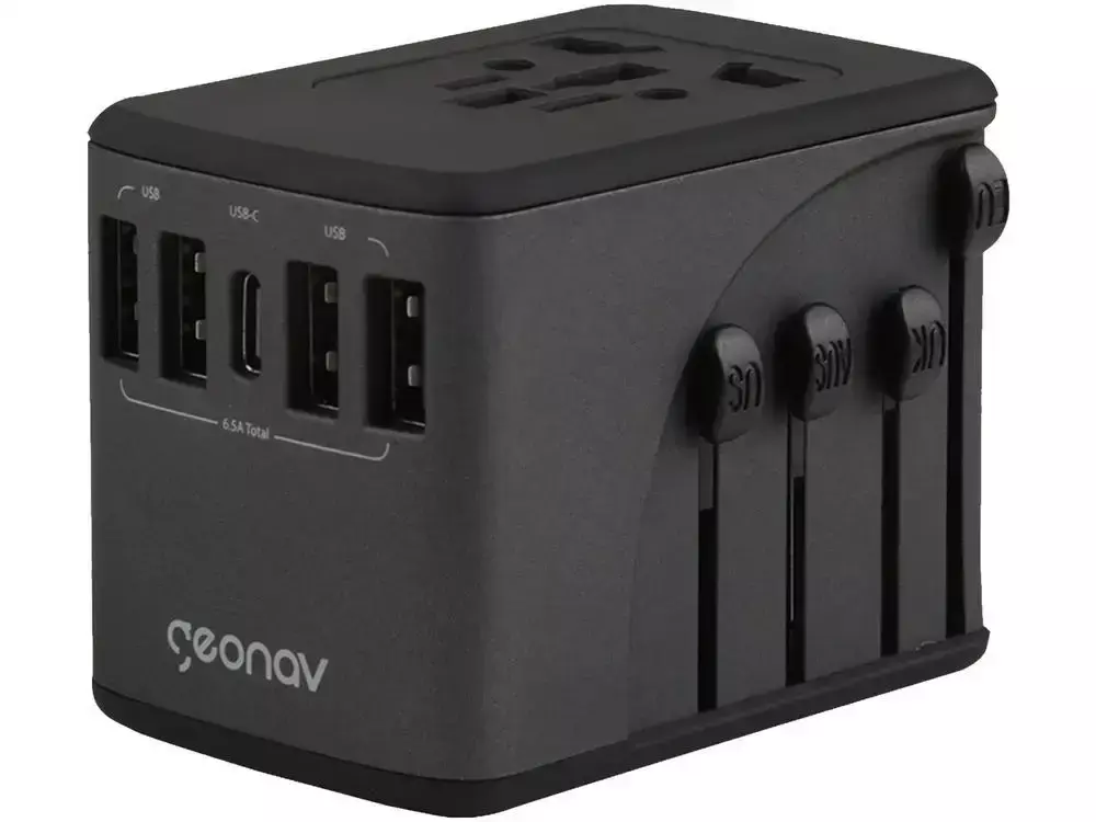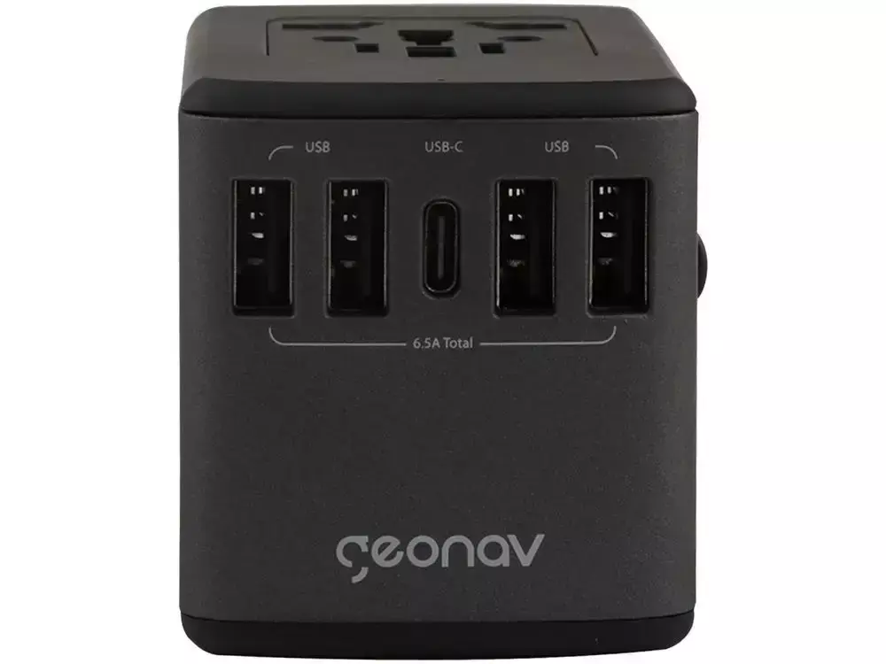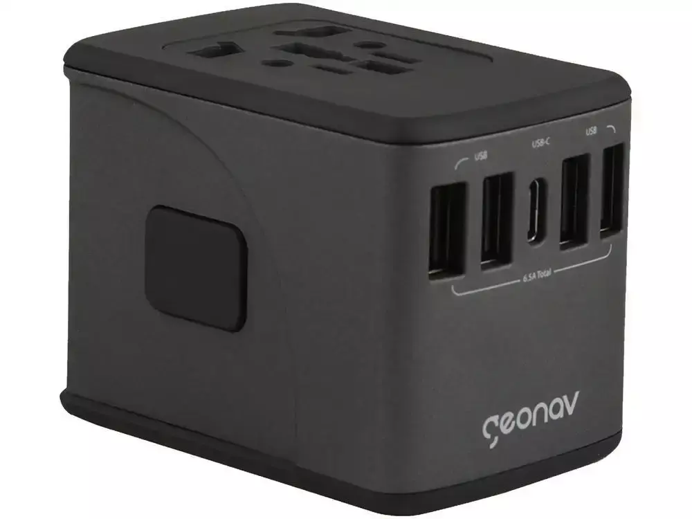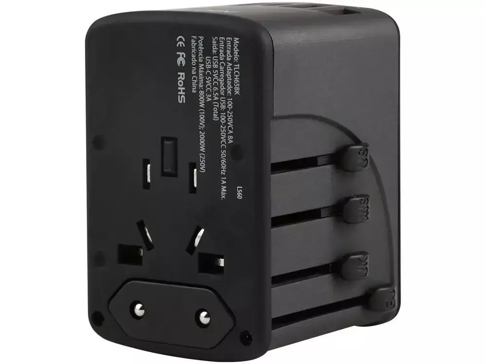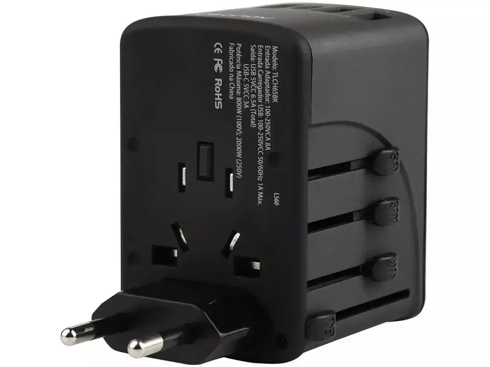O Carregador de Parede Universal (TLCH65BK) da Geonav é um acessório indispensável para sua viagem nacional ou internacional. Com capacidade para carga rápida de até 5 dispositivos ao mesmo tempo, ele possui 4 portas USB-A e 1 porta USB-C (6.5A), tudo em um design Bivolt.