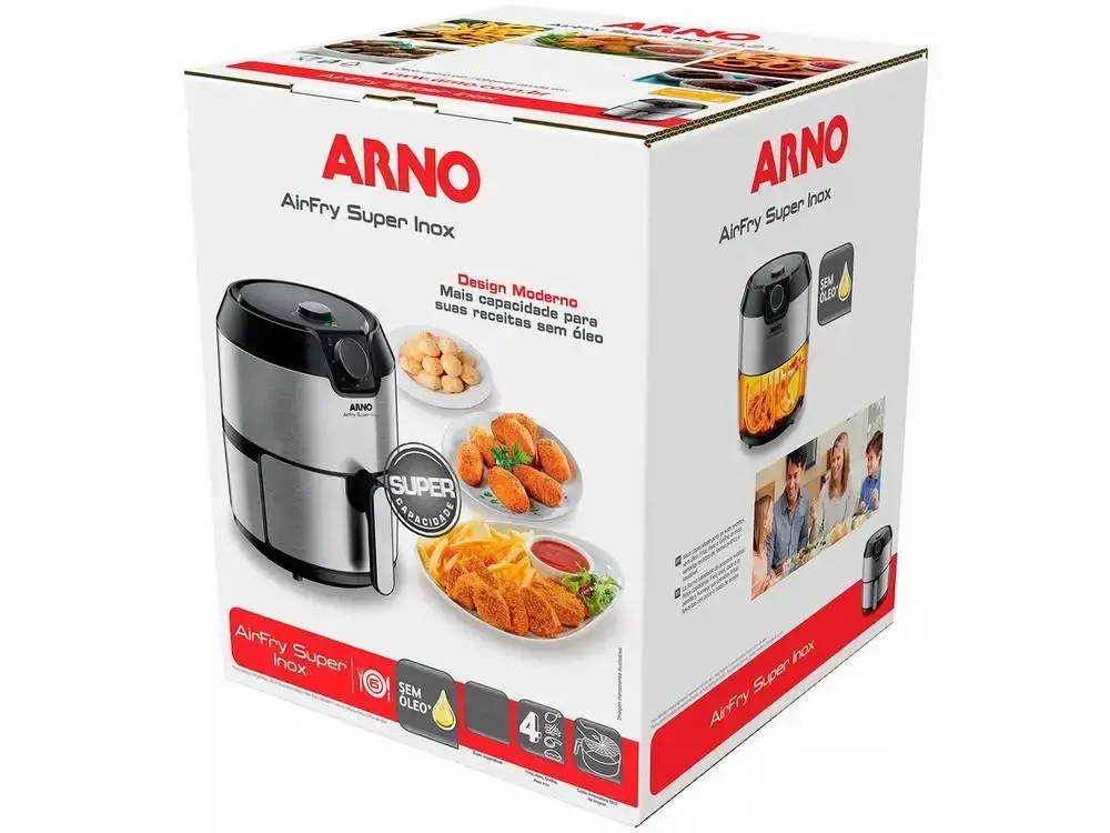 Com a Fritadeira elétrica Airfry Super (BFRY) preta e inox da Arno, você terá mais capacidade para as suas receitas sem óleo! Possui cesta com super capacidade de 4L (4,2L total) e serve até 6 pessoas. Possui 1400W de potência e opera em 220V.