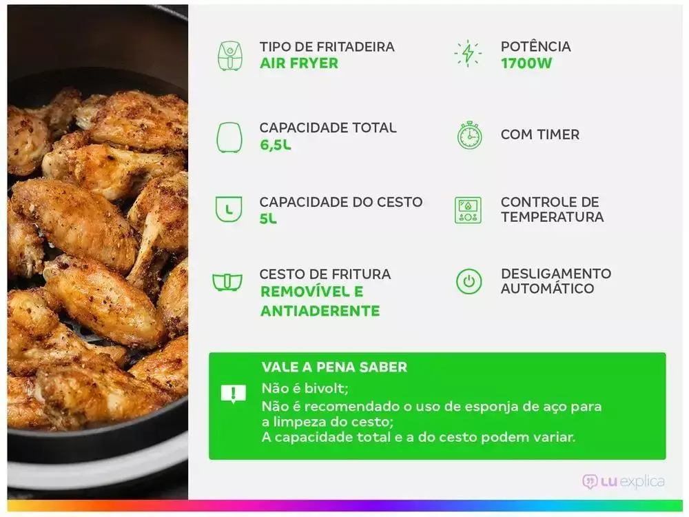 | Recursos | 8 Receitas Pré-sugeridas, Timer 60min, Cesto antiaderente (dupla camada) |