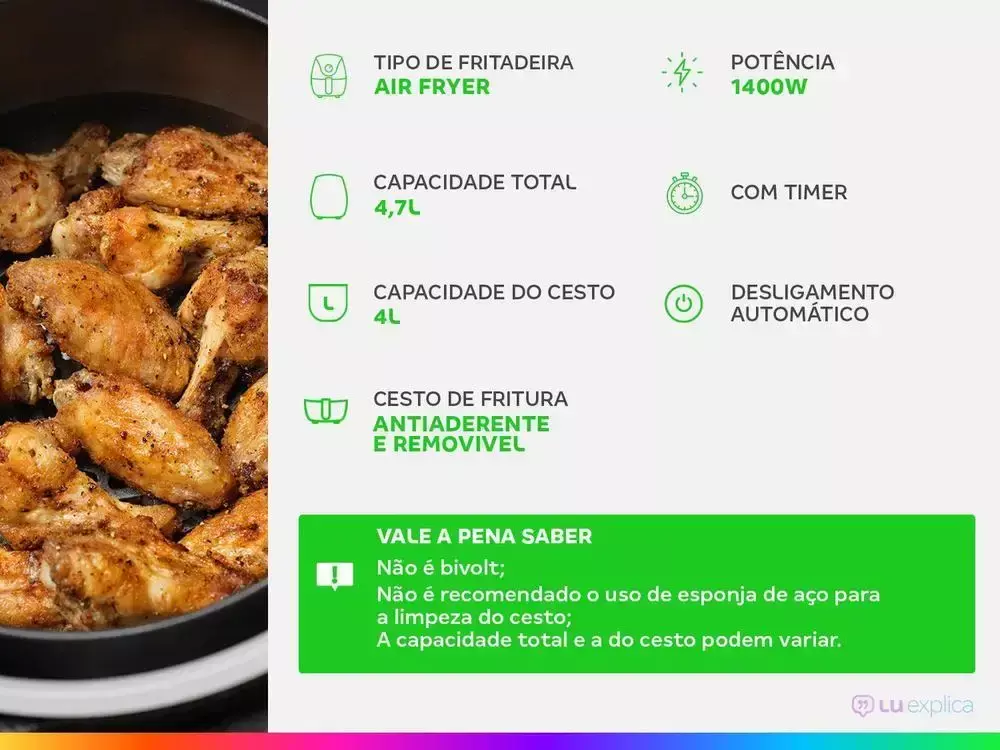 | Recursos | Timer Sonoro 30min, Receitas pré-programadas, Cesto antiaderente e removível |