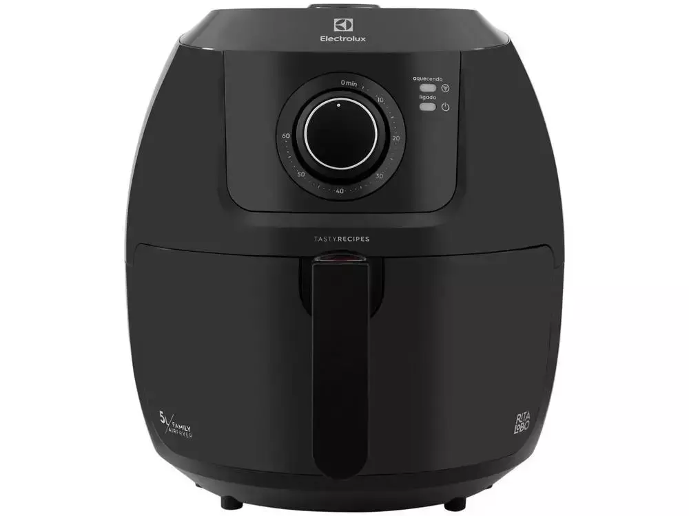 Faça comida de verdade, prática e gostosa, na quantidade ideal para toda a família com a AirFryer Electrolux Family Efficient (EAF50), assinada por Rita Lobo. Otimize o tempo de preparo fazendo, de uma só vez, porções maiores graças a sua alta capacidade de 5L. A AirFryer Electrolux por Rita Lobo conta com uma cuba de 6,5L, que comporta um cesto interno de 5L de capacidade total para que você possa compartilhar momentos deliciosos. Além da praticidade ao cozinhar, ela reduz quase 50%¹ das calorias e até 90%¹ das gorduras de suas preparações, além de possibilitar que você deixe de descartar até 24L de óleo por ano², contribuindo com a sustentabilidade. As 8 receitas pré-sugeridas no painel indicam tempo e temperatura de preparo. Faça pratos conhecidos, como pão de queijo, legumes, frango, e outros, com a certeza de um resultado delicioso e para toda a família. O cesto interno é removível e possui dupla camada de revestimento antiaderente, oferecendo maior durabilidade e facilidade de limpeza. Além disso, a cuba e o cesto são compatíveis com lava-louças. Ideal para o dia a dia, a AirFryer Electrolux Family Efficient por Rita Lobo é equipada com Timer de até 60 minutos. Passado o tempo de preparo selecionado, o produto desliga automaticamente, evitando que os alimentos passem do tempo de cozimento desejado para que alcancem o ponto certo. Intuitiva, a AirFryer de 5L oferece um seletor de temperatura com variação de 80°C a 200°C, assim você pode escolher a opção ideal para diversos preparos. ¹Testes realizados por nutricionista, com iscas de peixe empanado (250 g de tilápia) e duas formas de preparação: fritura convencional (utilizando 828g de óleo de girassol) e na AirFryer (utilizando 2g de azeite). O resultado demonstrou a redução de 48,6% de calorias e 89,4% de gordura quando preparado na AirFryer. ²Considerando o consumo de 24 pacotes de 500g de batata frita por ano. É necessário utilizar 1L de óleo para fritar um pacote de 500g de forma convencional, mas utilizando a AirFryer, apenas 25ml. Metatag Aproveite a alta capacidade de 5L da AirFryer Electrolux Family Efficient por Rita Lobo. Faça, de uma só vez, receitas na quantidade ideal para toda a família. O cesto com dupla camada antiaderente é mais durável e facilita a limpeza. Confira. CARACTERÍSTICAS CAPACIDADE DE 5L A cuba de 6,5L comporta um cesto interno de 5L de capacidade total para preparar receitas que servem toda a família. RECEITAS FÁCEIS DE FAZER E SAUDÁVEIS Ao preparar receitas na AirFryer, você reduz o consumo de óleo e prepara receitas com até 90%¹ menos de gordura e quase 50%¹ a menos de calorias. ¹Testes realizados por nutricionista, com iscas de peixe empanado (250 g de tilápia) e duas formas de preparação: fritura convencional (utilizando 828g de óleo de girassol) e na AirFryer (utilizando 2g de azeite). O resultado demonstrou a redução de 48,6% de calorias e 89,4% de gordura quando preparado na AirFryer. PAINEL COM 8 RECEITAS PRÉ-SUGERIDAS Indica tempo e temperatura de preparo. Praticidade em fazer pratos conhecidos com a certeza de um resultado delicioso. DURÁVEL E FÁCIL DE LIMPAR Cesto interno com dupla camada de revestimento antiaderente. Além de ser mais resistente, facilita a limpeza ao evitar que ingredientes grudem no fundo. PRATICIDADE PARA O DIA A DIA Cuba e cesto interno removíveis, compatíveis com lava-louças. SEGURANÇA PARA SUA ROTINA Timer de até 60 min que desliga automaticamente logo após alcançar o tempo selecionado, evitando que o cozimento exceda o período escolhido. SELETOR DE TEMPERATURA INTUITIVO Selecione a temperatura desejada. Com variação de 80°C a 200°C, permite que você alcance o ponto desejado de variadas receitas. MAIS SUSTENTÁVEL Deixe de descartar até 24L² de óleo por ano ao utilizar a AirFryer. ²Considerando o consumo de 24 pacotes de 500g de batata frita por ano. É necessário utilizar 1L de óleo para fritar um pacote de 500g de forma convencional, mas utilizando a AirFryer, apenas 25ml.
