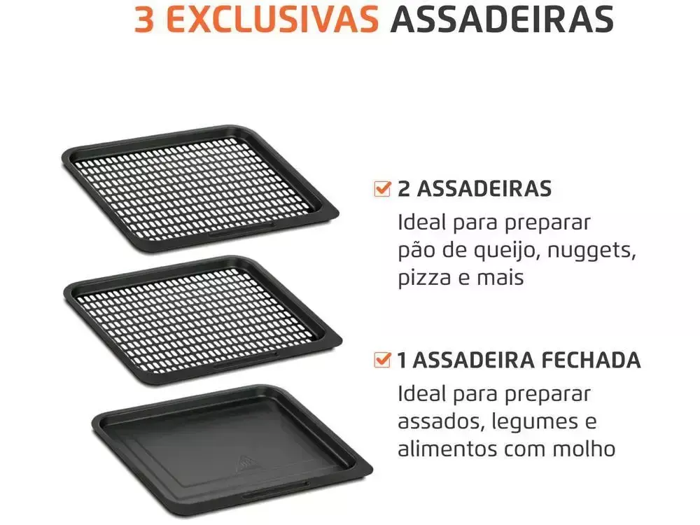 | Itens Inclusos | 1 Fritadeira Elétrica, 2 Assadeiras, 1 Bandeja Coletora, 1 Livro de Receitas, Manual de Instruções |