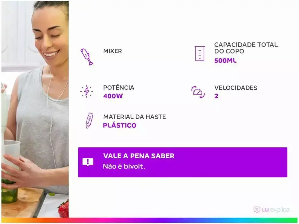 | Itens Inclusos | 1 Mixer, 1 Mini processador, 1 Batedor, 1 Copo Medidor (500ml), Manual |