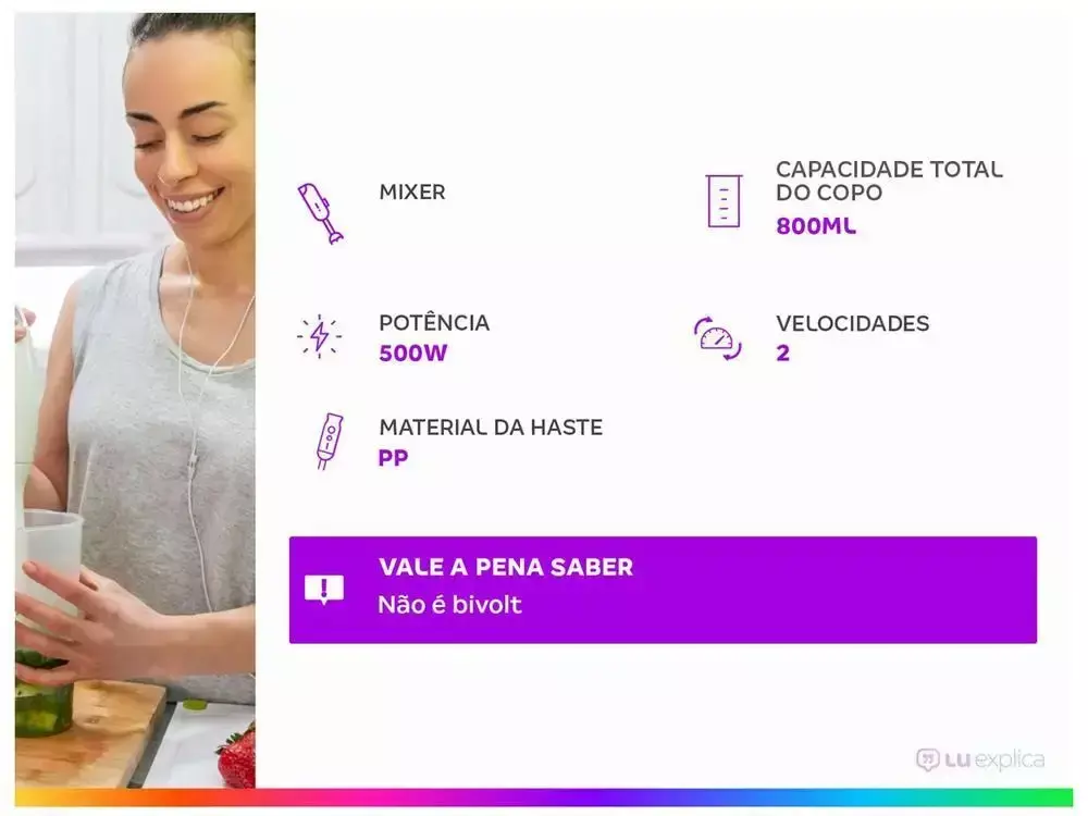 | Itens Inclusos | 1 Mixer, 1 Copo com Tampa, 1 Processador |