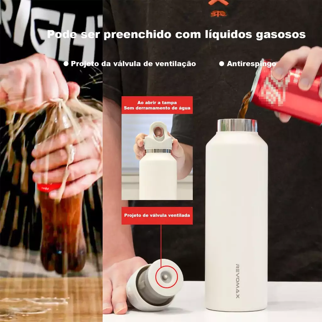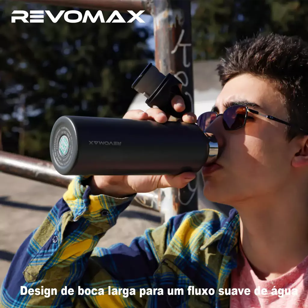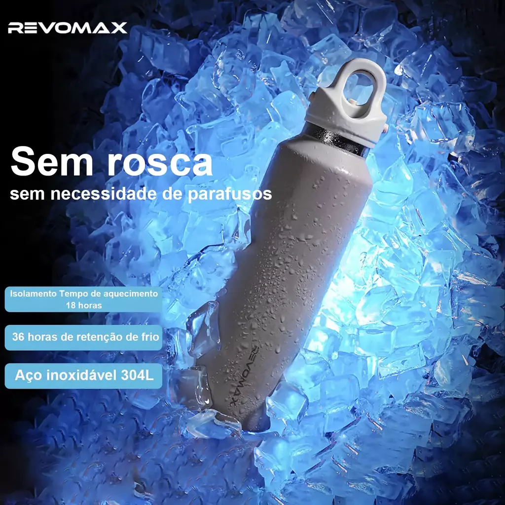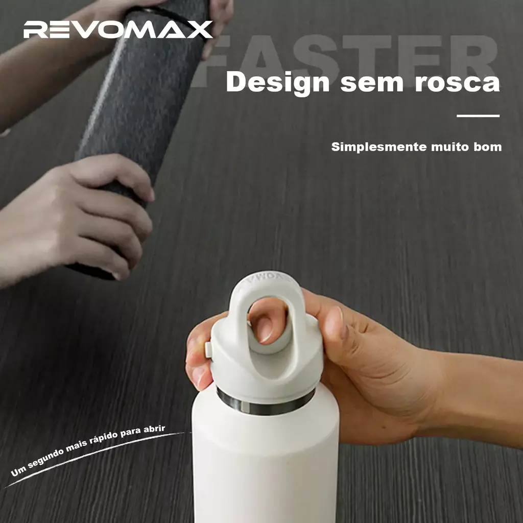 Descubra a revolução em garrafas térmicas com a REVOMAX 950ml. Com um design inovador sem parafuso (rosca), ela permite abrir e fechar com apenas uma mão. Seu isolamento a vácuo de alta performance mantém bebidas quentes por 18h e frias por até 36h.