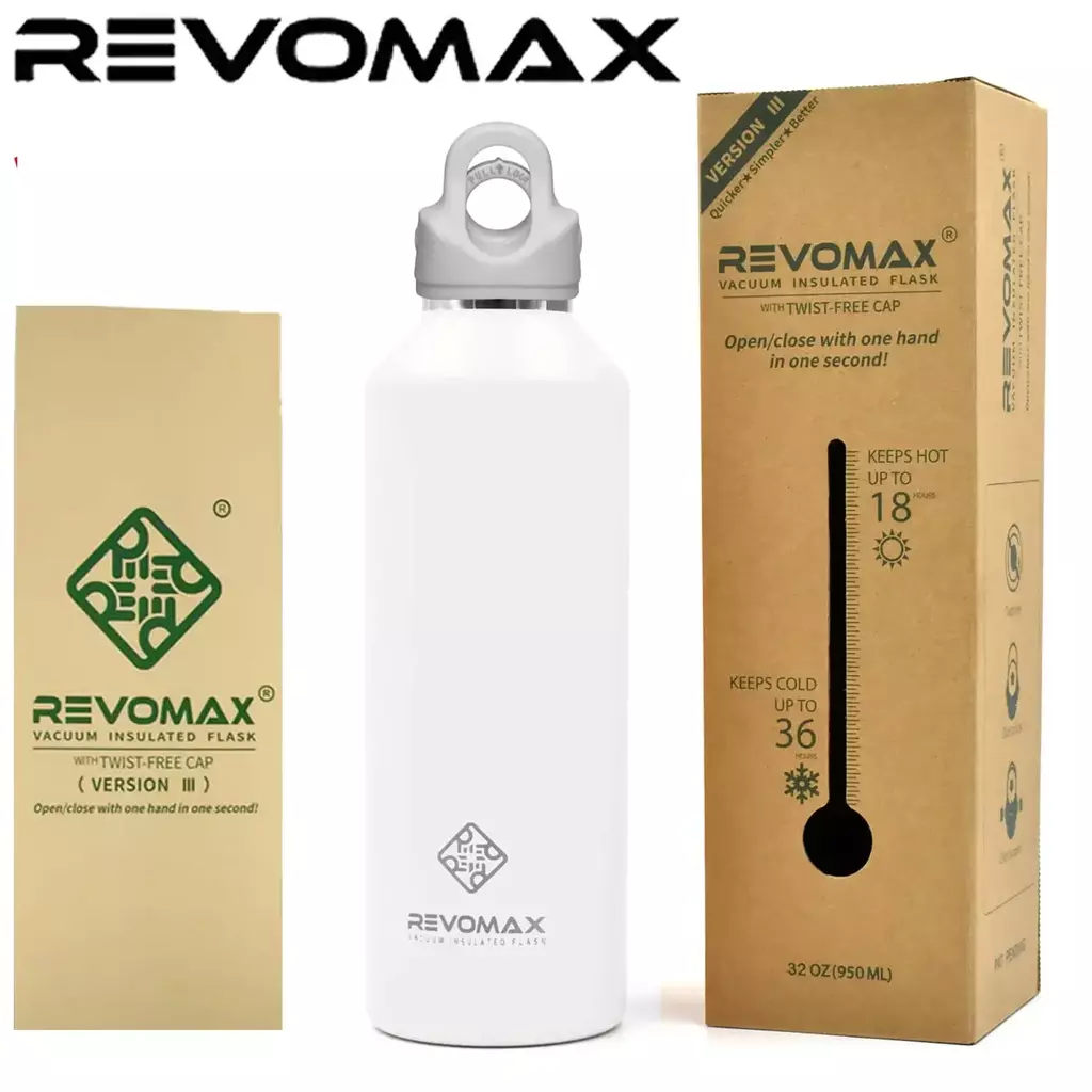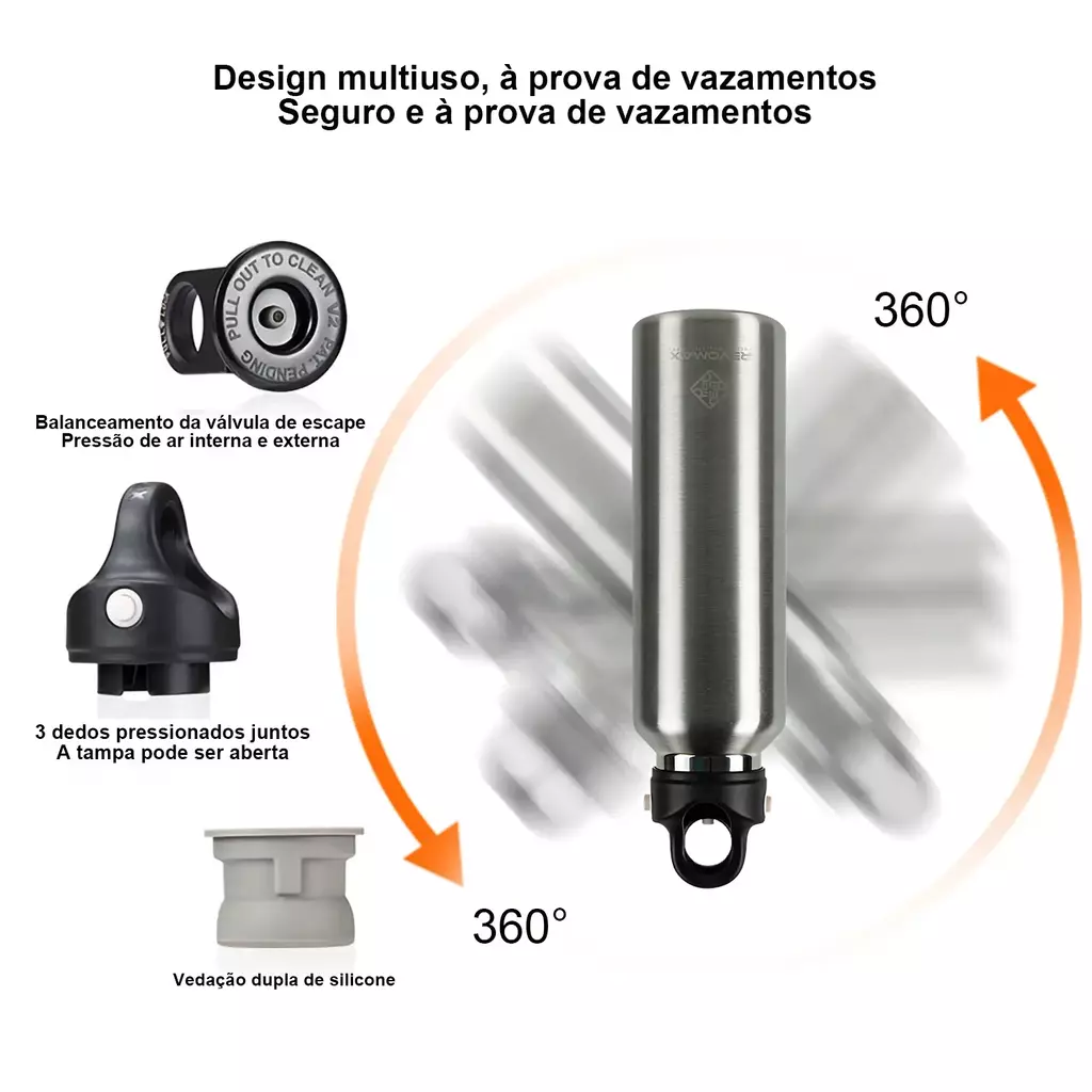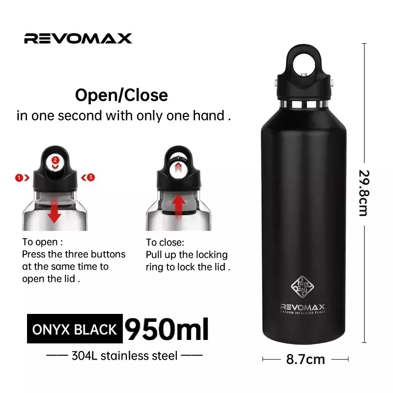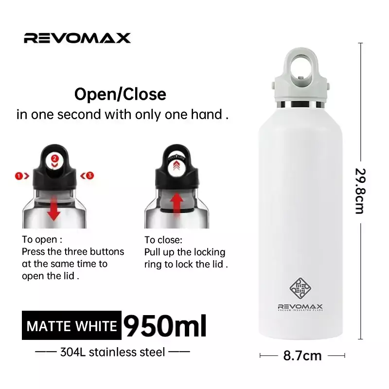 Descubra a revolução em garrafas térmicas com a REVOMAX 950ml. Com um design inovador sem parafuso (rosca), ela permite abrir e fechar com apenas uma mão. Seu isolamento a vácuo de alta performance mantém bebidas quentes por 18h e frias por até 36h.