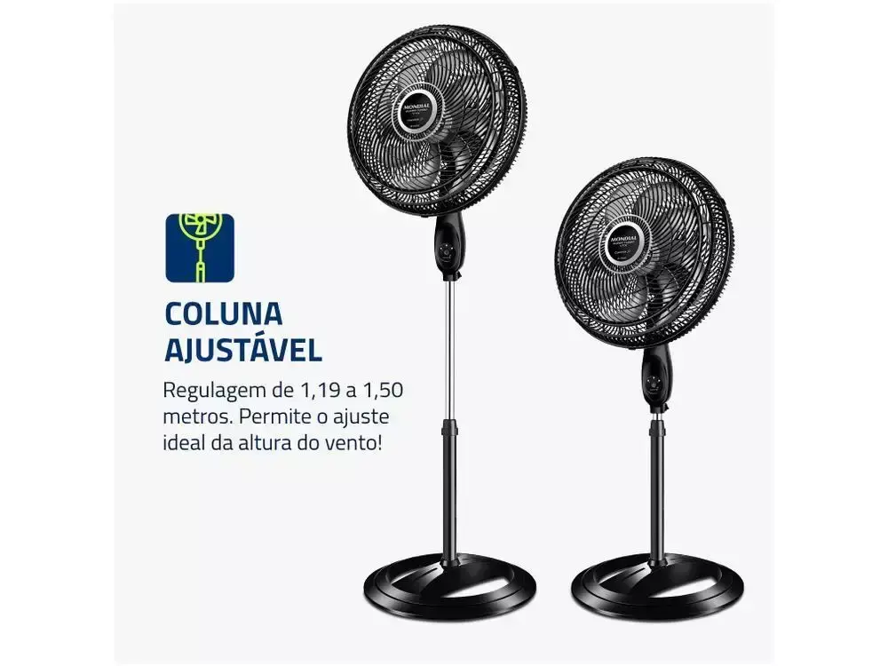 Transforme o clima da sua casa com este ventilador de coluna prático e eficiente. Ele oferece muito mais vento e menos barulho, garantindo o bem-estar de toda a família. Com 40cm de diâmetro e uma potente hélice de 8 pás, este modelo da Mondial é sinônimo de eficiência, segurança e grande vazão de ar.